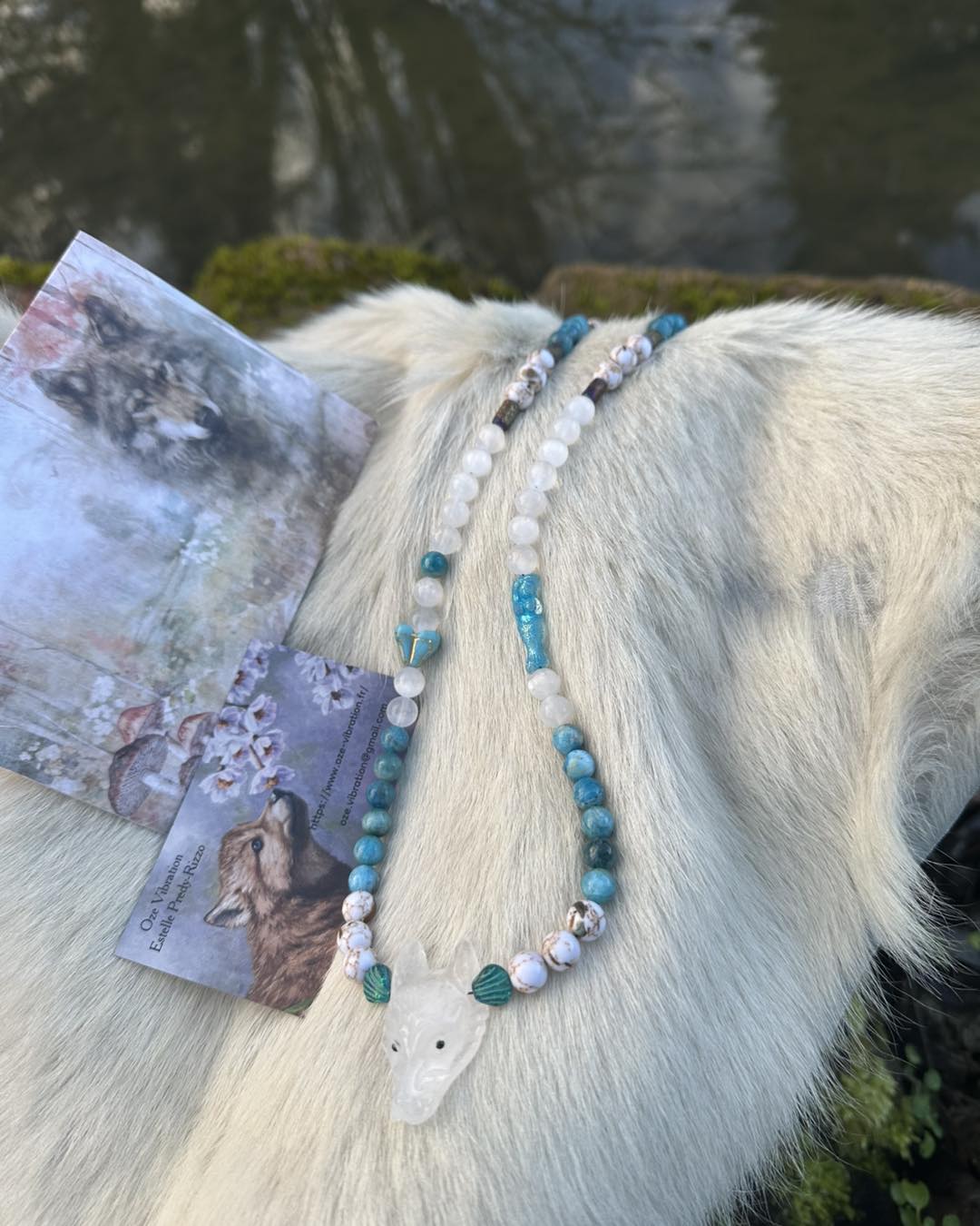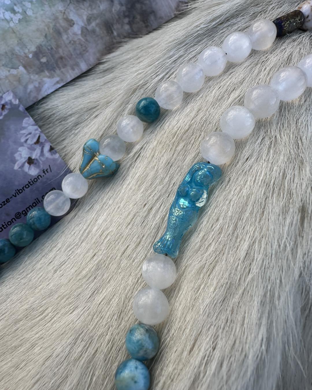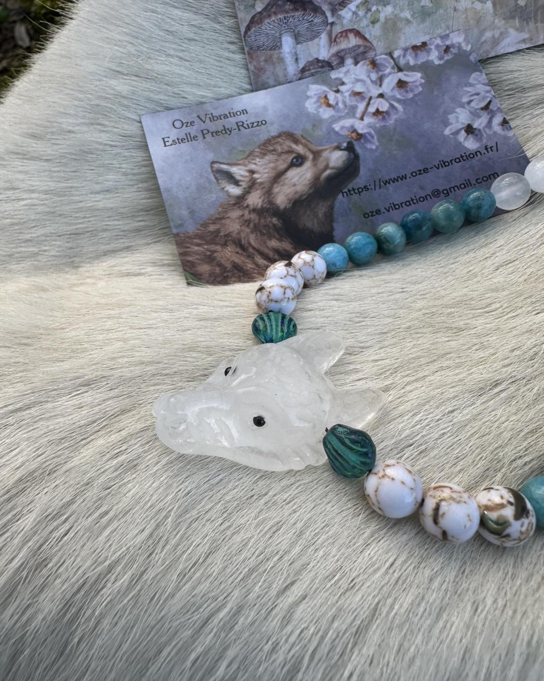 Au centre,la Louve en quartz pur,mémoire vivante des origines, veille sur la vérité de l'âme et accompagne les femmes appelées par l'eau, la lune et l'intuition. Pierres & symboles Quartz pur – clarté, mémoire, essence Apatite bleue – parole intuitive, fluidité émotionnelle Sélénite – lumière lunaire, purification douce Howlite coquillage – apaisement, sagesse incarnée Perles en verre tchèque – Sirène & Fleurs d'eau, symboles des eaux anciennes et de la renaissance Ce collier est une clé vibratoire, une reconnexion à la source,un appel à marcher fluide, vraie et alignée.