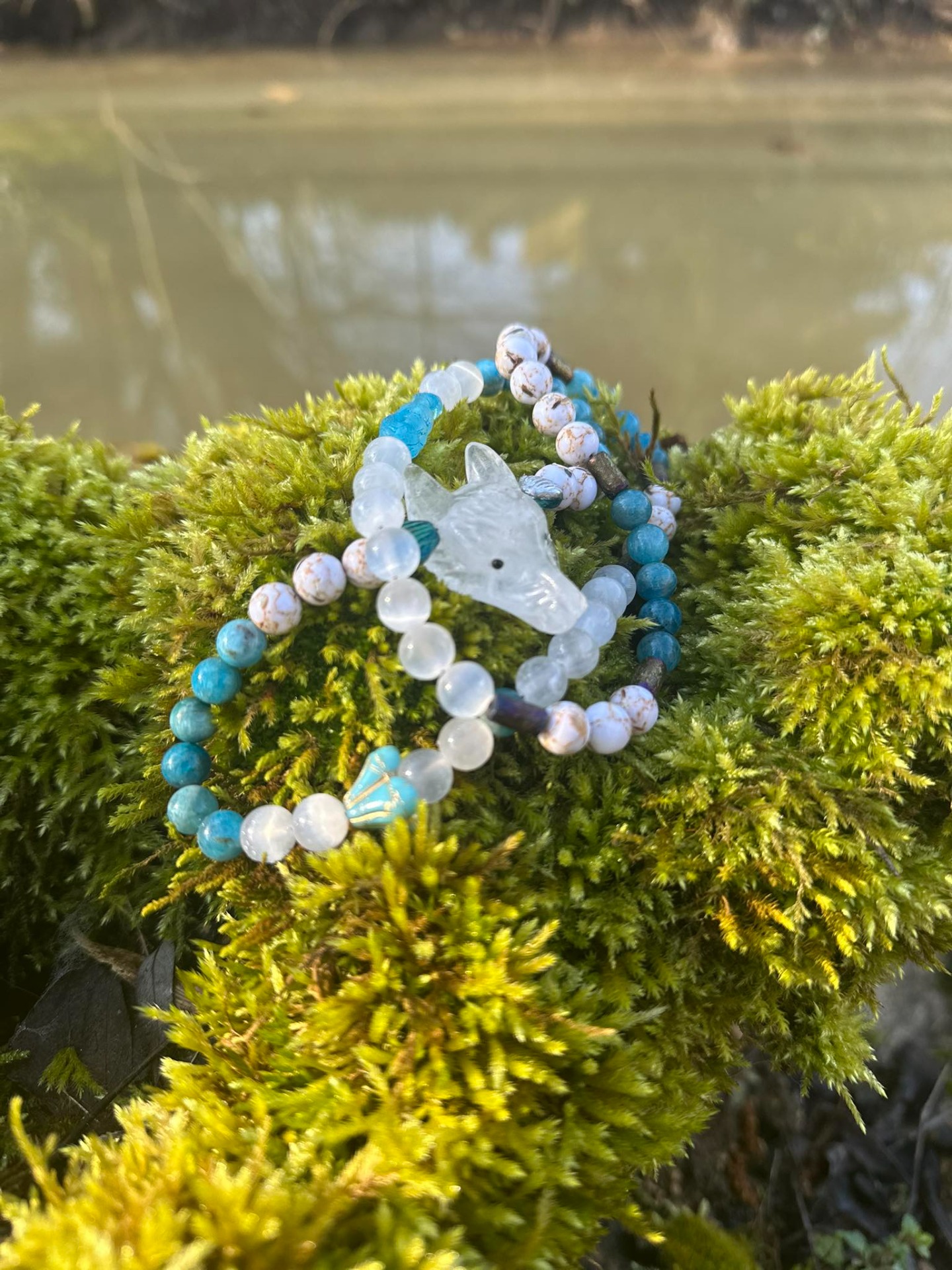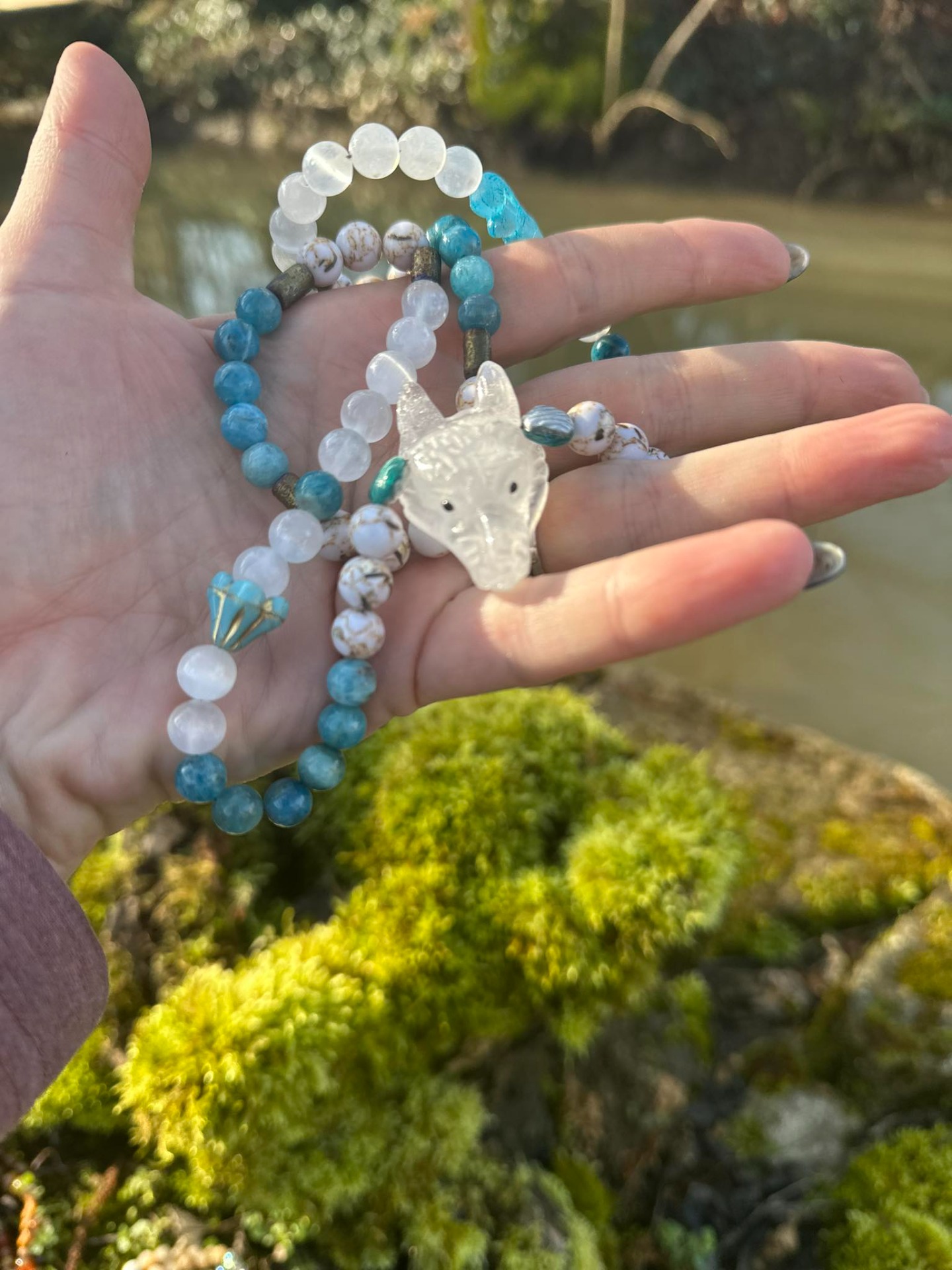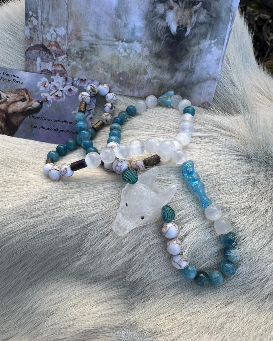 Au centre,la Louve en quartz pur,mémoire vivante des origines, veille sur la vérité de l'âme et accompagne les femmes appelées par l'eau, la lune et l'intuition. Pierres & symboles Quartz pur – clarté, mémoire, essence Apatite bleue – parole intuitive, fluidité émotionnelle Sélénite – lumière lunaire, purification douce Howlite coquillage – apaisement, sagesse incarnée Perles en verre tchèque – Sirène & Fleurs d'eau, symboles des eaux anciennes et de la renaissance Ce collier est une clé vibratoire, une reconnexion à la source,un appel à marcher fluide, vraie et alignée.