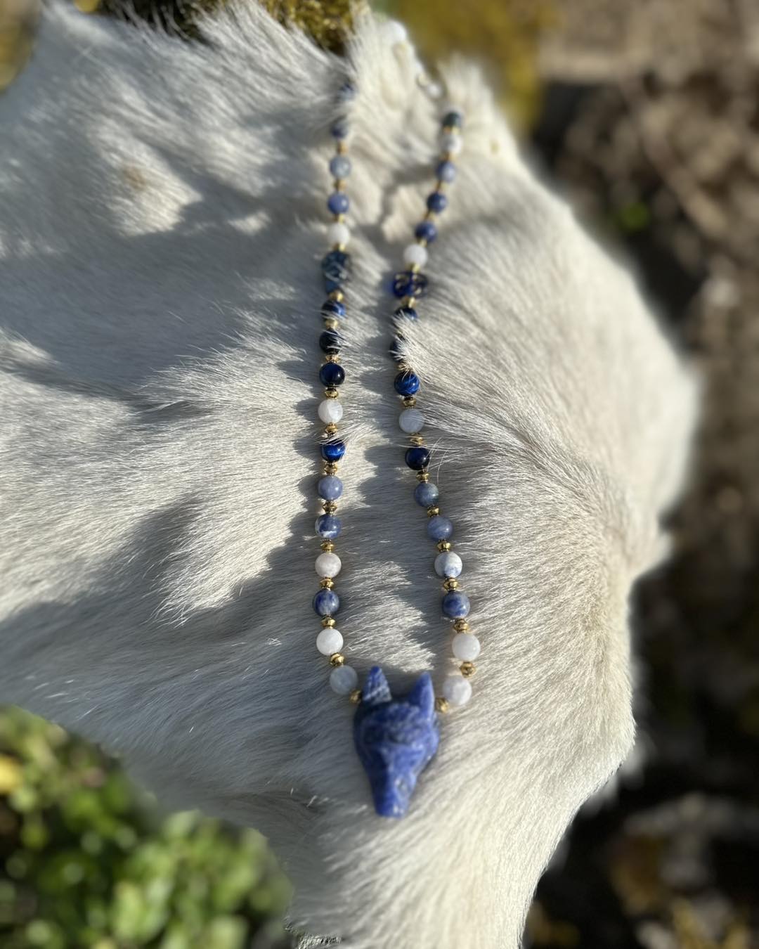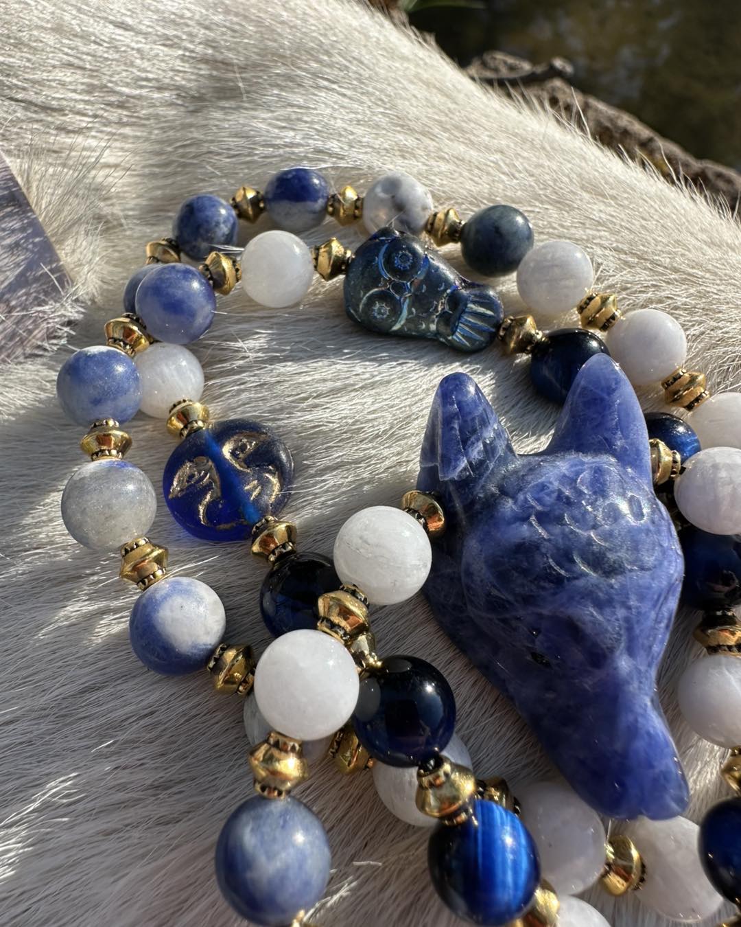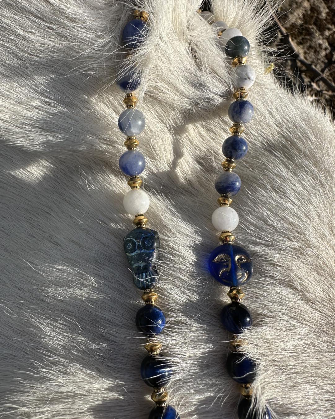 Le collier Nostra Azura est une pièce initiatique, reliée au cercle étoilé des 13 Mères Originelles. Un espace sacré où le féminin se transmet, se guérit et se révèle. La Louve en sodalite t'enveloppe comme une nuit douce. Elle calme le tumulte intérieur, elle dissout les illusions ,elle t'amène face à ta vérité L'œil de tigre azur est une armure subtile. Il protège ton espace intérieur lorsque tu traverses des zones sensibles de ton être. Il ancre ta conscience dans ton corps pendant les voyages invisibles. La péristérite ouvre les portes du dedans. Rêves, ressentis, visions, cycles…Elle t'enseigne que la transformation ne fait pas de bruit. Qu'elle se vit dans l'intime, dans le secret sacré du féminin. Les perles dorées sont les éclats de conscience. Des prises de lumière, qui apparaissent après chaque traversée. Le hibou est l'esprit du clan. Il ne protège pas…il révèle. La lune azur est représenté les 13 Lunes Elle marque les femmes qui acceptent de se rencontrer profondément.