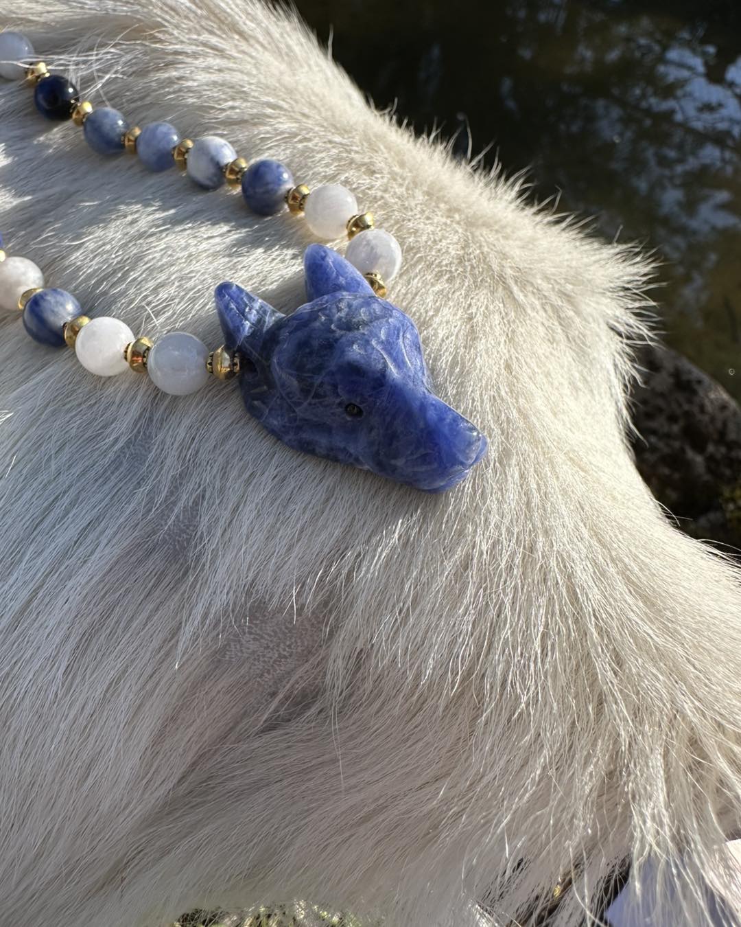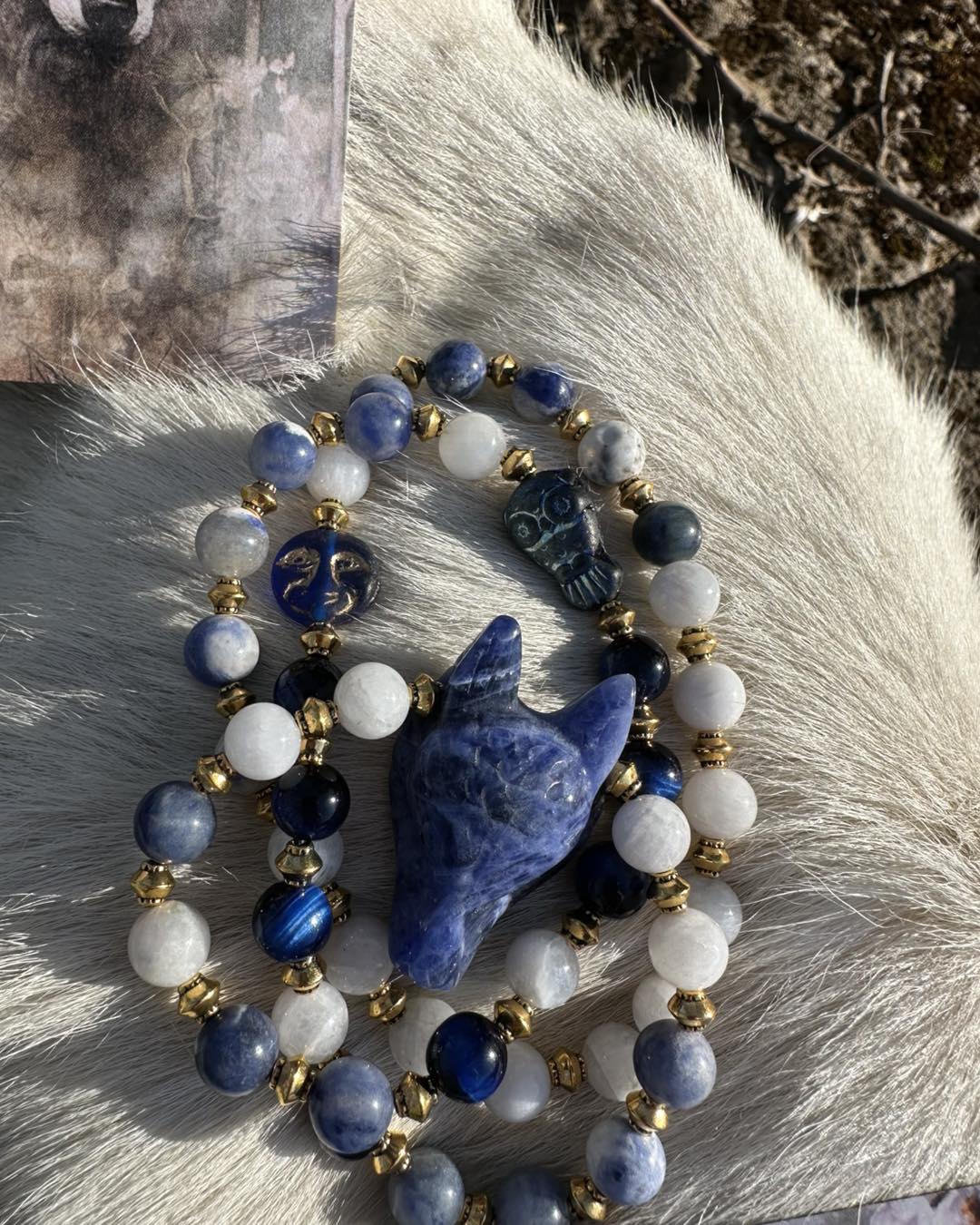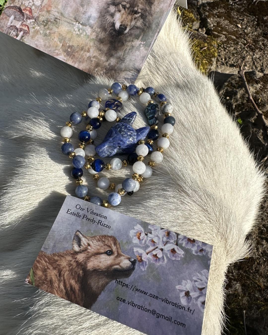 Le collier Nostra Azura est une pièce initiatique, reliée au cercle étoilé des 13 Mères Originelles. Un espace sacré où le féminin se transmet, se guérit et se révèle. La Louve en sodalite t'enveloppe comme une nuit douce. Elle calme le tumulte intérieur, elle dissout les illusions ,elle t'amène face à ta vérité L'œil de tigre azur est une armure subtile. Il protège ton espace intérieur lorsque tu traverses des zones sensibles de ton être. Il ancre ta conscience dans ton corps pendant les voyages invisibles. La péristérite ouvre les portes du dedans. Rêves, ressentis, visions, cycles…Elle t'enseigne que la transformation ne fait pas de bruit. Qu'elle se vit dans l'intime, dans le secret sacré du féminin. Les perles dorées sont les éclats de conscience. Des prises de lumière, qui apparaissent après chaque traversée. Le hibou est l'esprit du clan. Il ne protège pas…il révèle. La lune azur est représenté les 13 Lunes Elle marque les femmes qui acceptent de se rencontrer profondément.