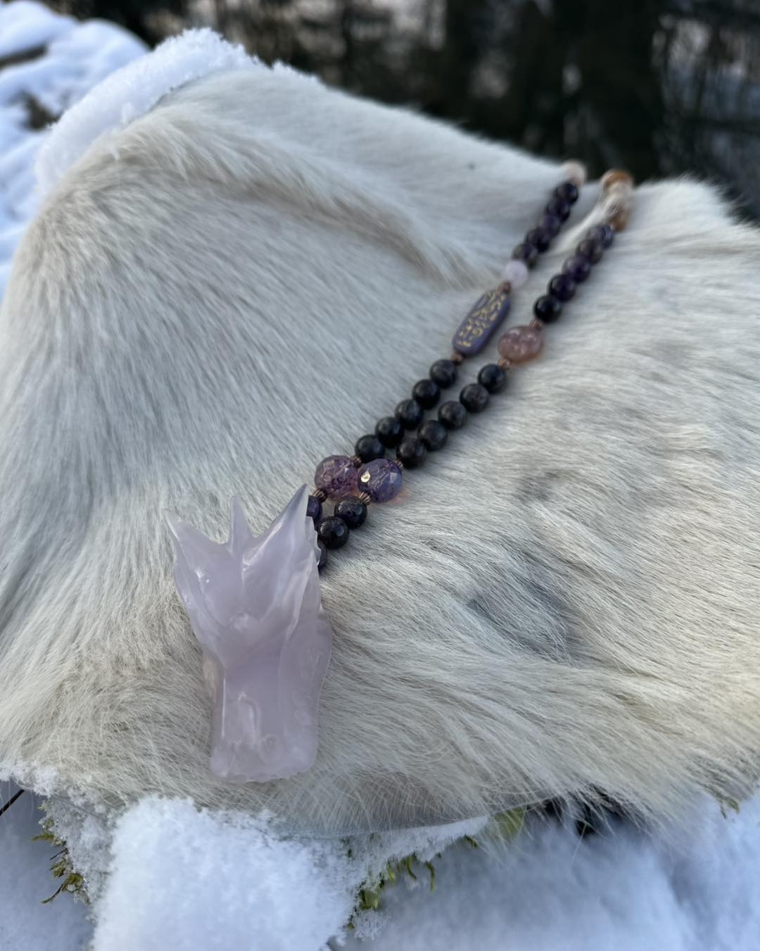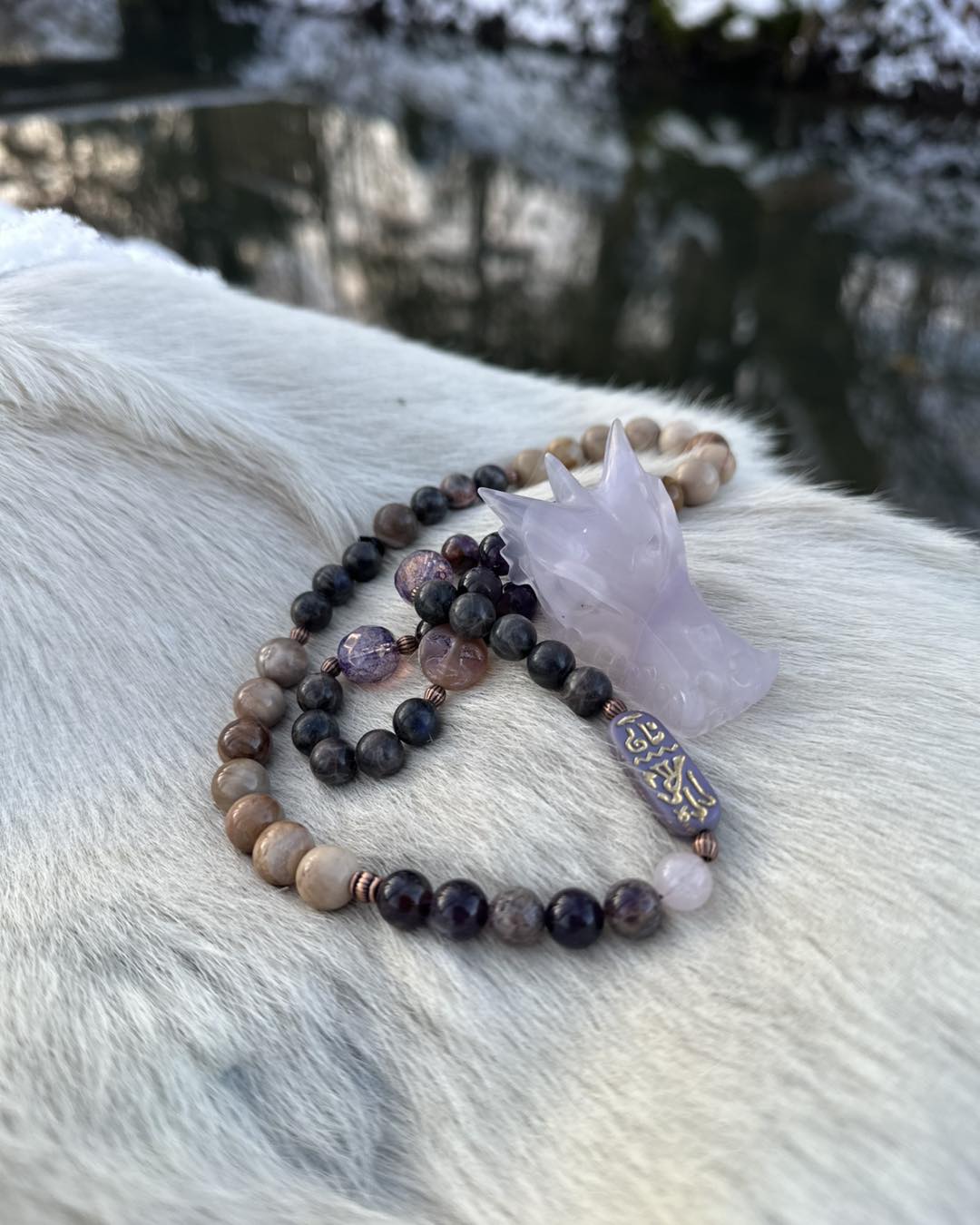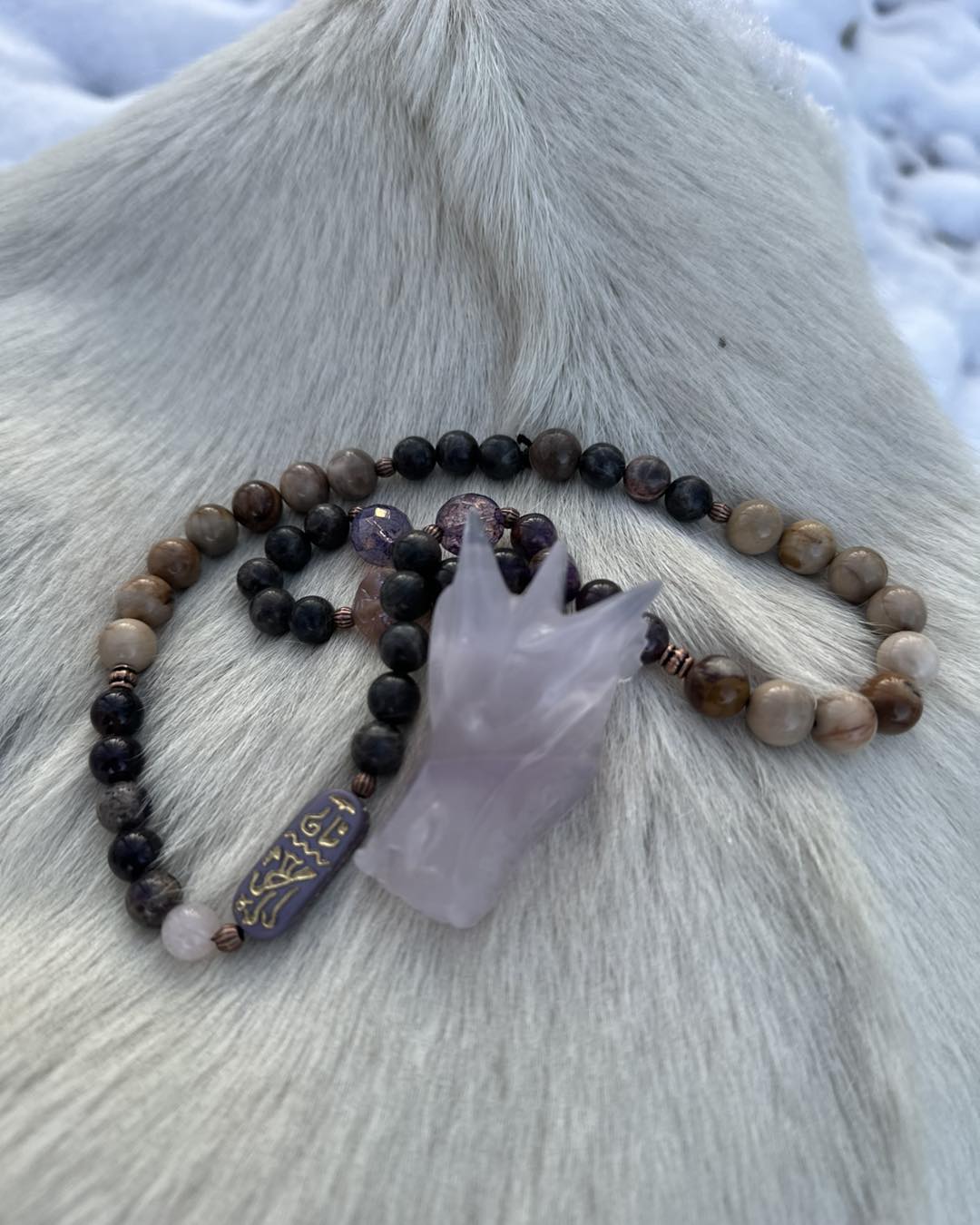 Sérénité de Femmes évoque : • le calme intérieur • l'apaisement des émotions • une protection douce • un espace de repos et de douceur pour le cœur« Sérénité de Femmes t'enveloppe de douceur, apaise tes tempêtes intérieures et t'accompagne vers un calme protecteur. »Collier talisman – description matérielle • Le pendentif principal est un crâne de dragon sculpté en fluorite lavande, dans des nuances violette pâle et translucides. • Le collier est composé de différentes perles : • perles de labradorite "chocolat", gris-brun avec reflets discrets, • perles de bois fossilisé de 10 mm, dans des tons beiges à bruns, • perles d'améthyste de Zambie, violettes, certaines facettées. • Il comporte également : • des perles en verre tchèque violettes, • un cartouche en verre tchèque représentant une déesse égyptienne, • une perle ronde "pleine lune" en verre tchèque, avec motif clair sur fond violet. • Des intercalaires métalliques sont placés entre certaines perles pour rythmer l'ensemble. L'ensemble associe des tons violets, bruns et boisés, avec un mélange de pierres naturelles, de bois fossilisé et de perles en verre décoratives. Ce talisman se présente avec une énergie apaisante, comme une présence douce qui protège et réconforte. Le crâne de dragon en fluorite lavande apporte une sensation de calme intérieur ; il invite à relâcher les tensions, à respirer plus profondément et à retrouver de la légèreté dans le cœur et dans l'esprit.Les perles de labradorite chocolat agissent comme une enveloppe protectrice, aidant à garder distance avec ce qui pèse ou fatigue.Le bois fossilisé apporte la stabilité et la solidité d'une base sûre, rappelant la force qui s'est construite au fil du temps.L'améthyste de Zambie apporte une note de douceur et de clarté, soutenant l'apaisement émotionnel et le recentrage.Les perles de verre tchèque violettes, le cartouche égyptien et la pleine lune évoquent le féminin qui rayonne, les cycles de transformation et la capacité de se renouveler sans se perdre.Ce collier talisman accompagne les femmes qui souhaitent se sentir protégées, apaisées et soutenues, tout en restant connectées à leur sensibilité et à leur force tranquille.