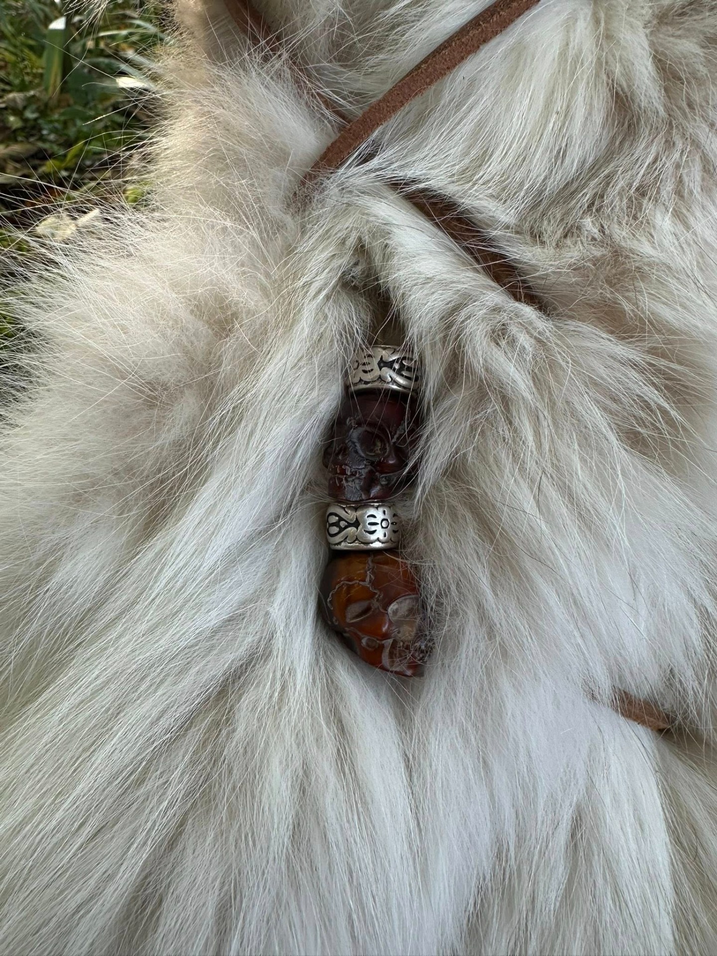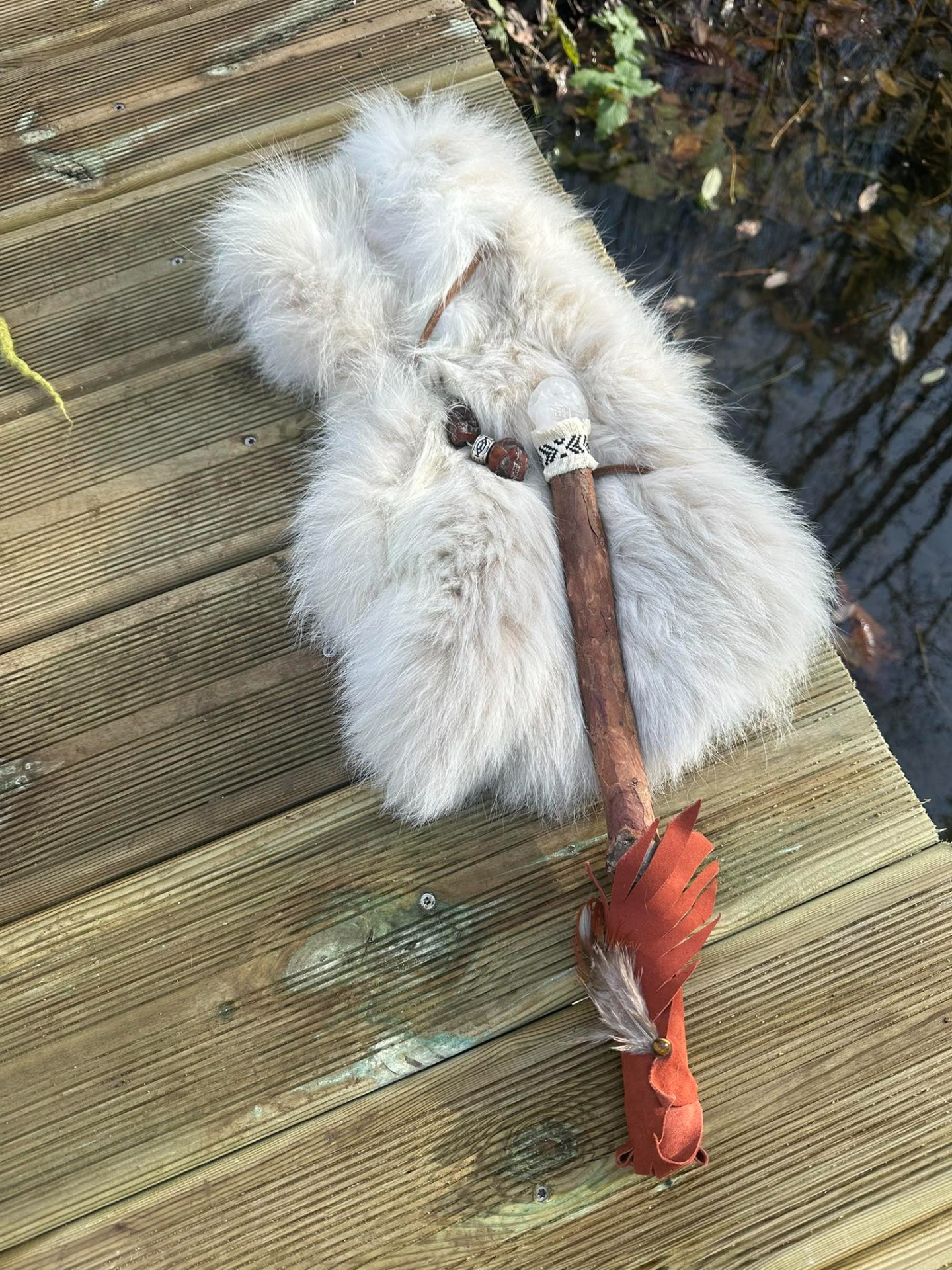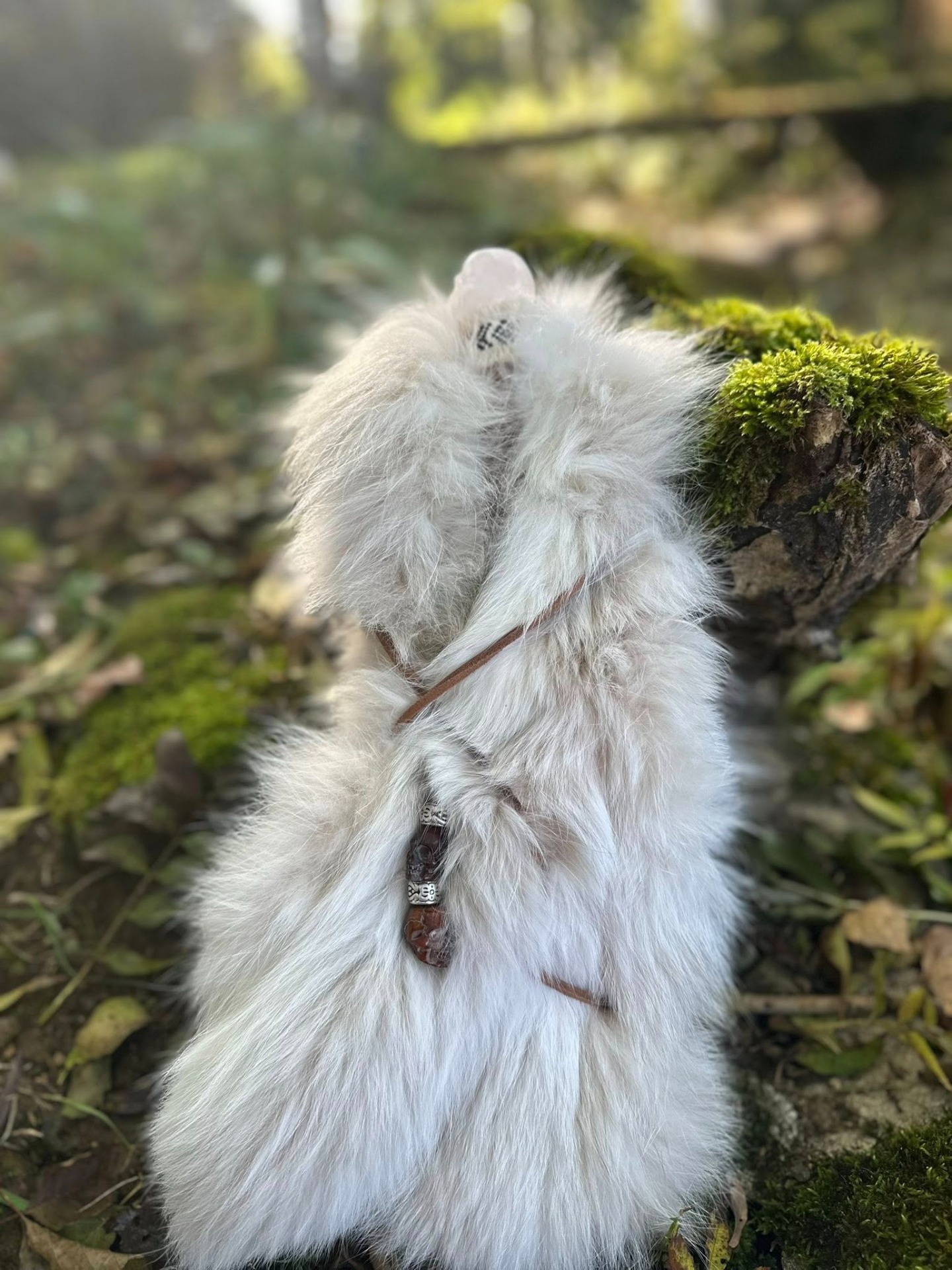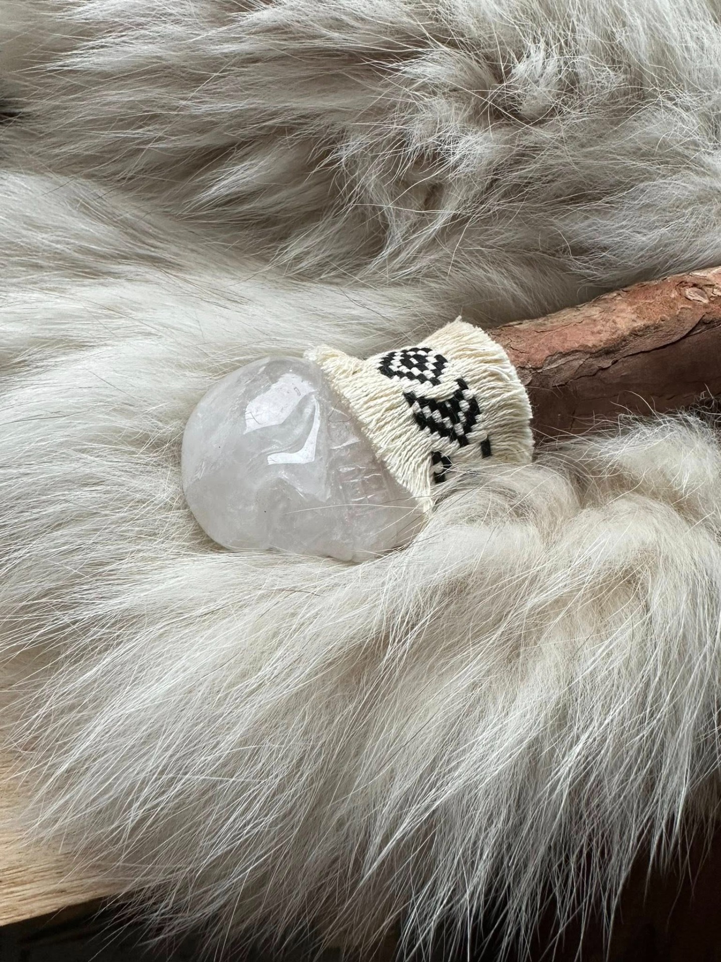 Tzoharaï n'est pas une simple mailloche, mais une entité-esprit née de l'union des règnes. Le séquoia millénaire lui a offert sa force et sa mémoire, le cristal a insufflé la clarté et l'ouverture des visions, le renard blanc a déposé sa ruse lumineuse, et le yak des montagnes a gravé en elle l'endurance et la sagesse du cycle. Lorsque la chamane l'appelle, Tzoharaï résonne comme une voix ancestrale. Chaque frappe qu'elle porte au tambour n'est pas un simple son, mais une porte ouverte : un passage entre l'ombre et la lumière, entre les vivants et les esprits, entre la Terre et les Étoiles. Tzoharaï devient ainsi bien plus qu'un nom : c'est l'identité vibratoire de ton bâton-médecine, un allié vivant doté de souffle et de mission. Cette mailloche est un prolongement du souffle de la Femme Chamane. Elle porte à son sommet un crâne de cristal, gardien de la mémoire universelle et des chants oubliés. Chaque frappe sur le tambour devient une onde qui traverse les mondes, reliant les ancêtres, les esprits et la terre. Le cristal ouvre la voie des visions et amplifie la résonance spirituelle du tambour, guidant vers les plans subtils. L'Écrin de Fourrure de Renard Blanc. L'écrin en fourrure de renard blanc recyclée n'est pas seulement une protection : il est un cocon énergétique. Le renard blanc, esprit discret et rusé, apporte la vigilance, l'adaptabilité et la lumière dans l'ombre. Il enveloppe la mailloche comme un voile de pureté et de silence, préservant son énergie entre chaque rituel et renforçant sa dimension sacrée. Les Crânes en Os de YakLes petits crânes sculptés en os de yak sont des messagers. Ils rappellent la cyclicité de la vie, l'impermanence et la reliance avec le monde animal. Le yak, gardien des hautes montagnes, incarne la force, la persévérance et la résistance dans l'adversité. Ces crânes ajoutent à la mailloche une vibration chamanique profonde, reliant aux esprits alliés et aux mondes invisibles. Le Séquoia – Colonne Céleste