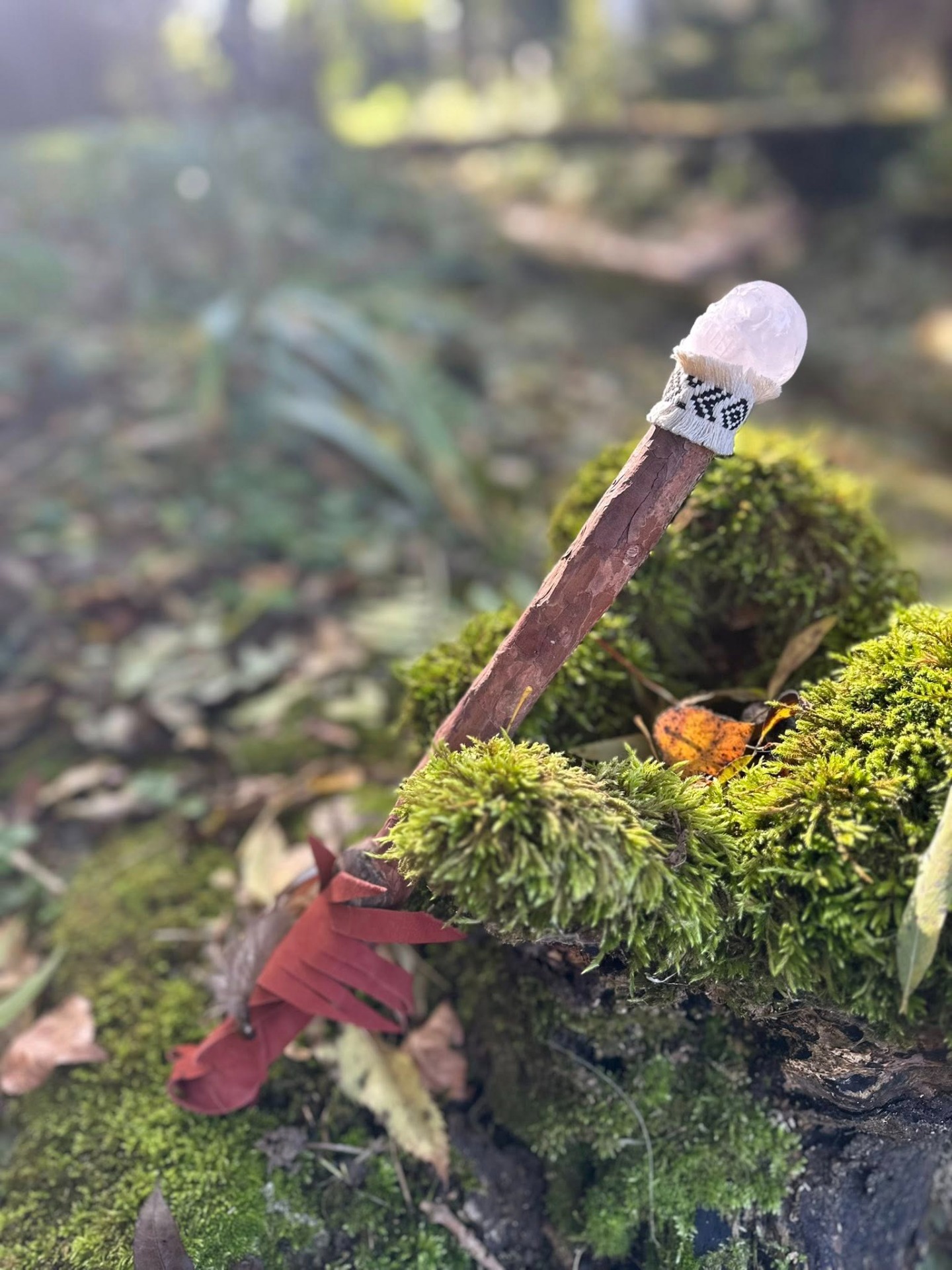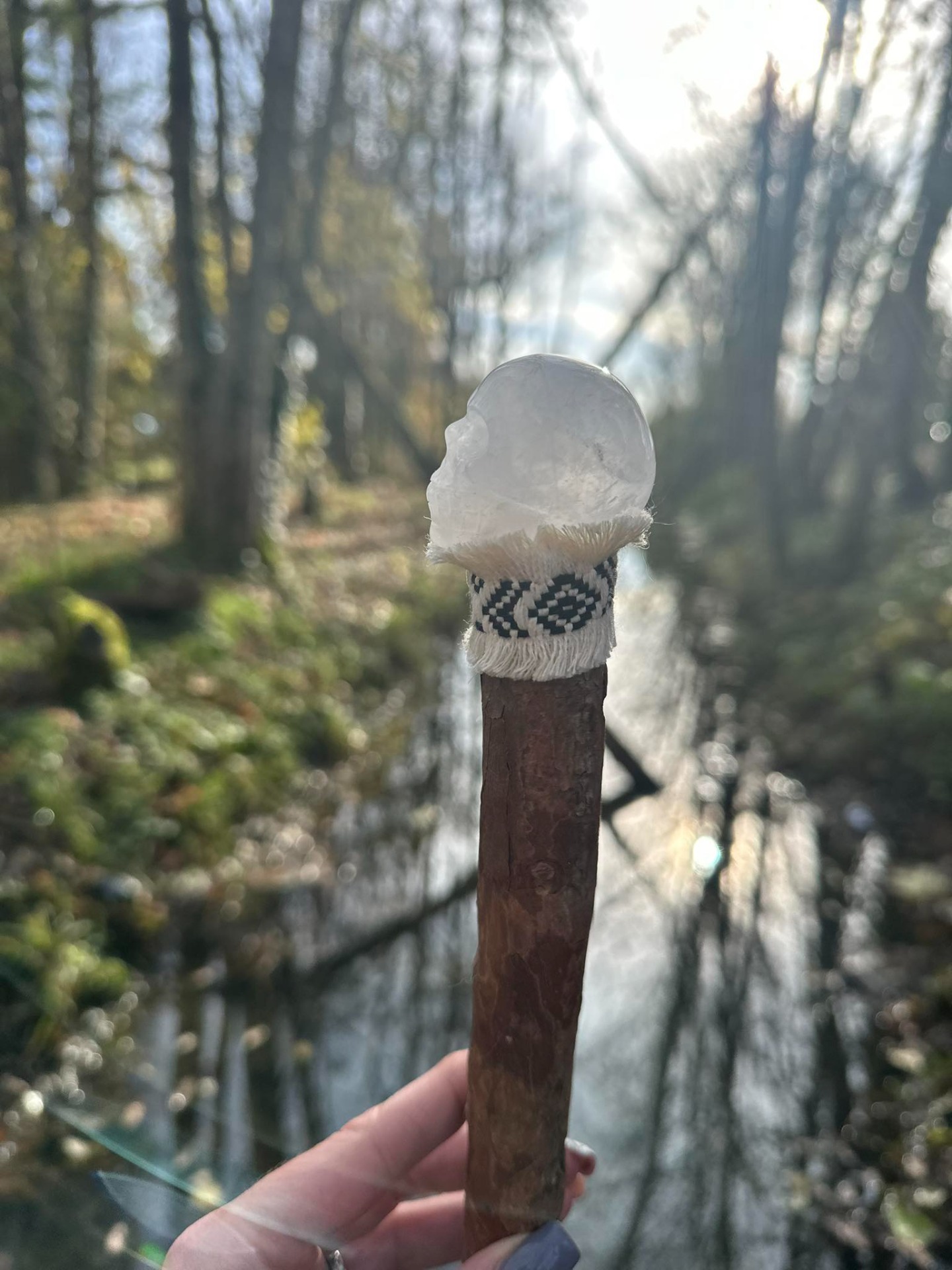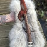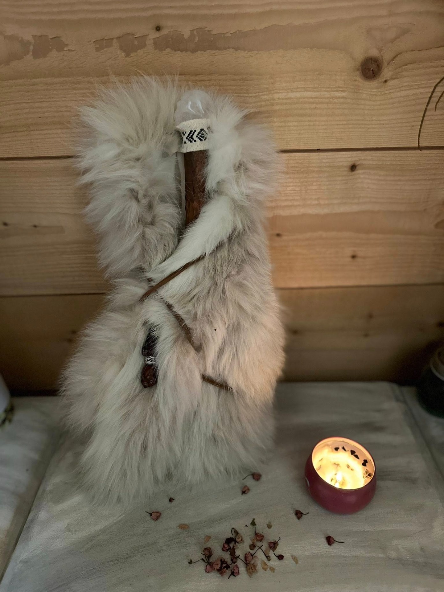 Tzoharaï n'est pas une simple mailloche, mais une entité-esprit née de l'union des règnes. Le séquoia millénaire lui a offert sa force et sa mémoire, le cristal a insufflé la clarté et l'ouverture des visions, le renard blanc a déposé sa ruse lumineuse, et le yak des montagnes a gravé en elle l'endurance et la sagesse du cycle. Lorsque la chamane l'appelle, Tzoharaï résonne comme une voix ancestrale. Chaque frappe qu'elle porte au tambour n'est pas un simple son, mais une porte ouverte : un passage entre l'ombre et la lumière, entre les vivants et les esprits, entre la Terre et les Étoiles. Tzoharaï devient ainsi bien plus qu'un nom : c'est l'identité vibratoire de ton bâton-médecine, un allié vivant doté de souffle et de mission. Cette mailloche est un prolongement du souffle de la Femme Chamane. Elle porte à son sommet un crâne de cristal, gardien de la mémoire universelle et des chants oubliés. Chaque frappe sur le tambour devient une onde qui traverse les mondes, reliant les ancêtres, les esprits et la terre. Le cristal ouvre la voie des visions et amplifie la résonance spirituelle du tambour, guidant vers les plans subtils. L'Écrin de Fourrure de Renard Blanc. L'écrin en fourrure de renard blanc recyclée n'est pas seulement une protection : il est un cocon énergétique. Le renard blanc, esprit discret et rusé, apporte la vigilance, l'adaptabilité et la lumière dans l'ombre. Il enveloppe la mailloche comme un voile de pureté et de silence, préservant son énergie entre chaque rituel et renforçant sa dimension sacrée. Les Crânes en Os de YakLes petits crânes sculptés en os de yak sont des messagers. Ils rappellent la cyclicité de la vie, l'impermanence et la reliance avec le monde animal. Le yak, gardien des hautes montagnes, incarne la force, la persévérance et la résistance dans l'adversité. Ces crânes ajoutent à la mailloche une vibration chamanique profonde, reliant aux esprits alliés et aux mondes invisibles. Le Séquoia – Colonne Céleste