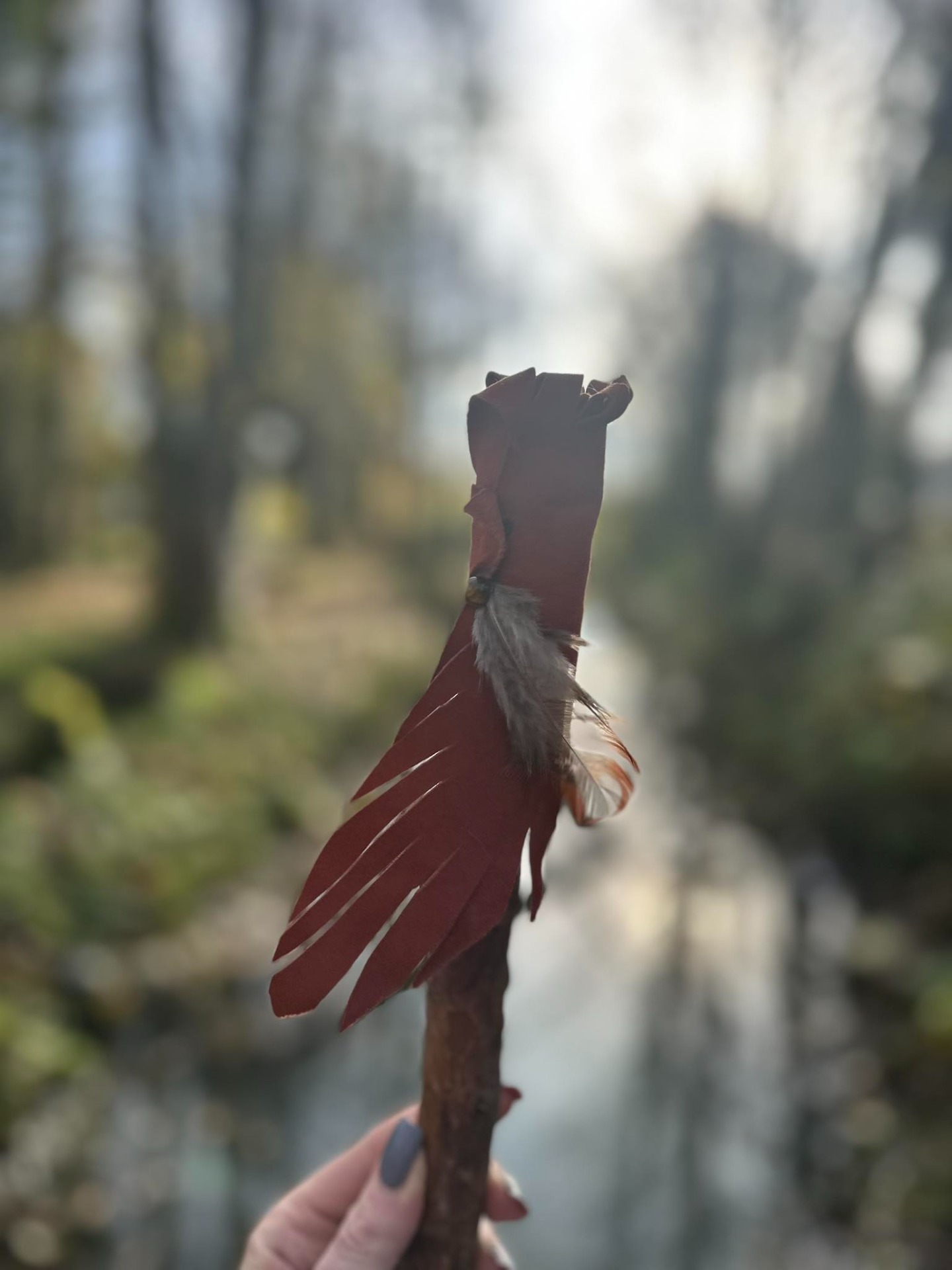 Le bois de séquoia donne à ta mailloche une dimension d'arbre cosmique, reliant la Terre au Ciel. Ces arbres millénaires sont considérés comme des gardiens de mémoire, porteurs des sagesses d'époques révolues et des futurs à venir. Dans ta mailloche, le séquoia agit comme axe du monde : il ancre profondément la chamane dans la Terre-Mère tout en lui permettant de se hisser dans les sphères célestes. Il transmet une énergie de longévité, de protection et de stabilité, permettant de soutenir le travail de guérison et d'ouverture des consciences dans la durée. Symbolique globale :Cette mailloche est l'incarnation de la Femme Médecine – celle qui frappe le tambour comme on ouvre un passage, qui insuffle aux sons la mémoire du cristal, la ruse du renard, la force du yak et la sagesse de la Terre. Elle devient non seulement un outil de musique, mais un sceptre chamanique, un bâton de pouvoir enveloppé de douceur, capable de convoquer les Esprits et d'ouvrir les portes de la conscience