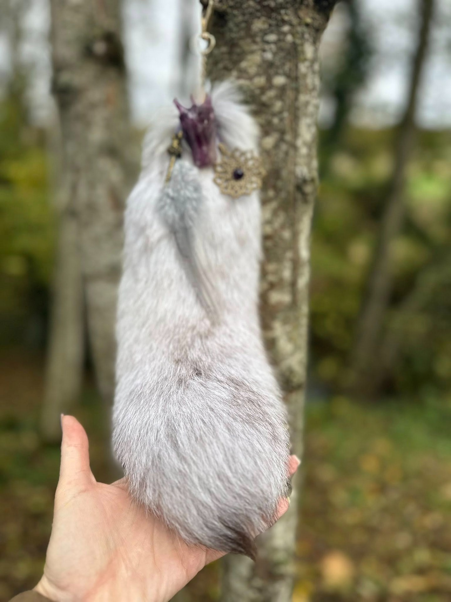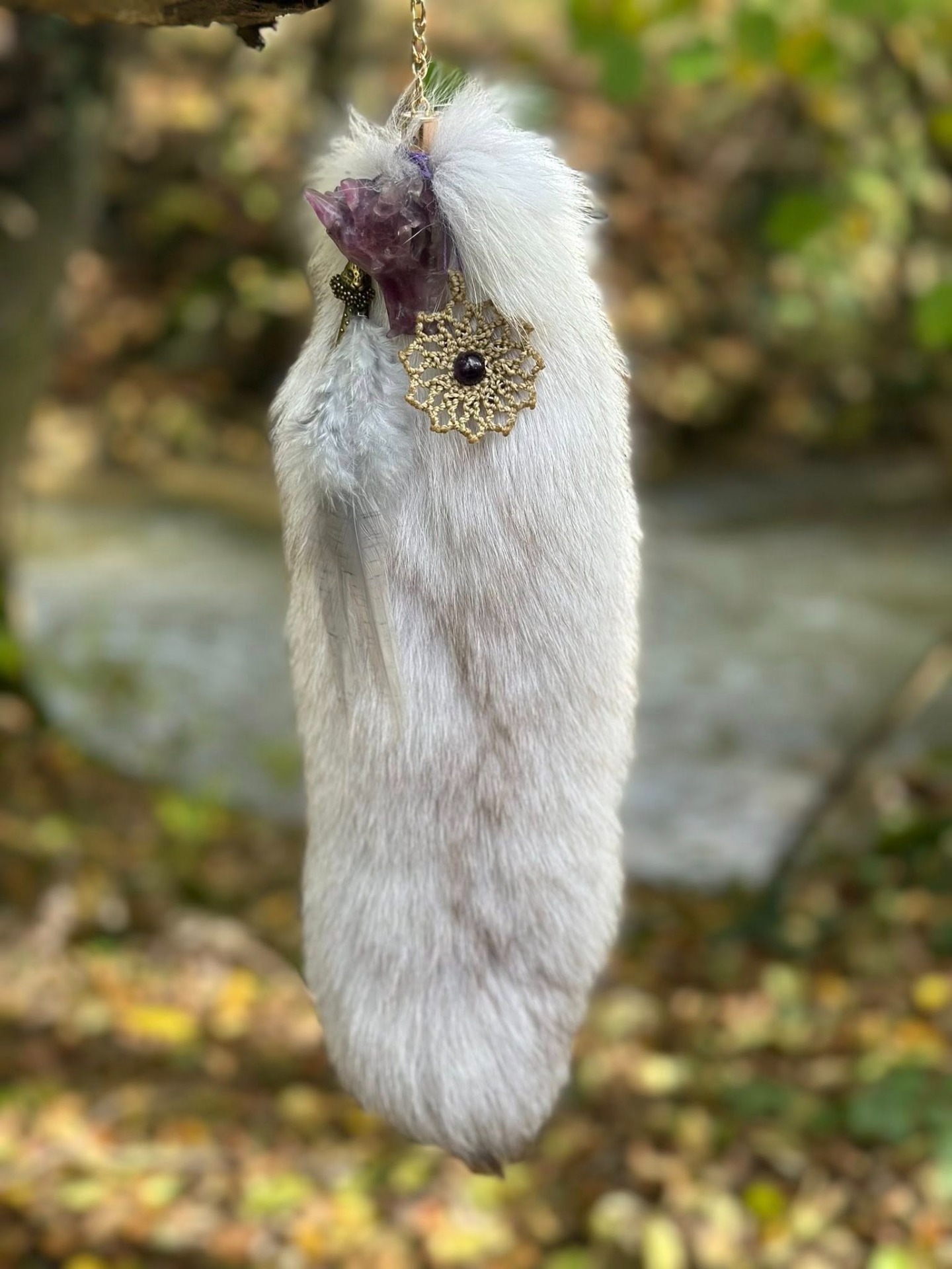 Il guide vers le terrier intérieur — cet espace secret où la magie retrouve son origine. Il est à la fois innocence et mystère, gardien du Temps et de la curiosité alchimique. La Fourrure de Renard recyclée grise douce et vaporeuse, elle évoque la brume matinale et la mémoire des sous-bois anciens, symbole de transformation silencieuse, elle rappelle que la magie véritable naît de l'observation, de la patience et de l'écoute.