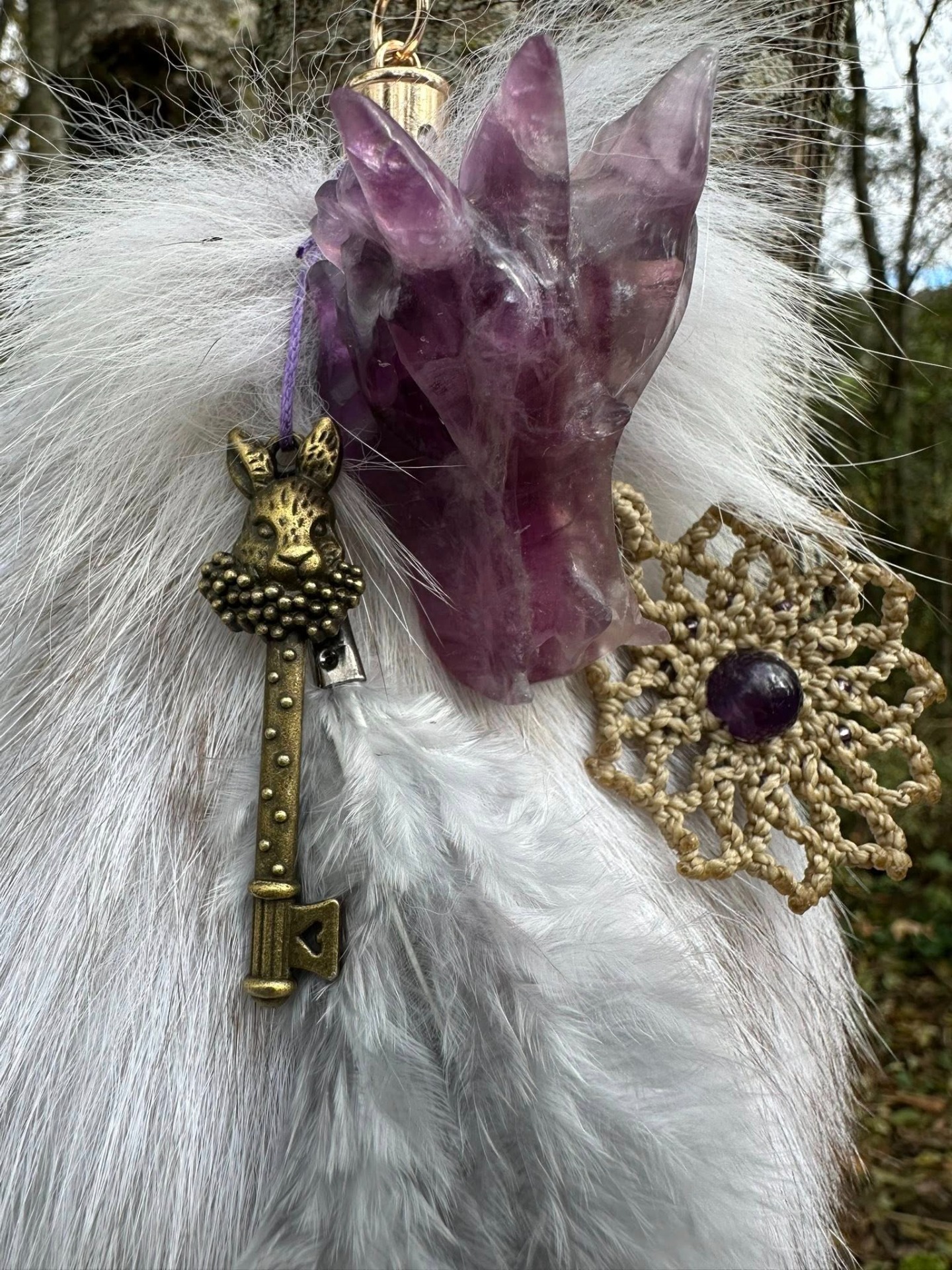 Crâne de Dragon en fluorite violette, mandala doré et clé du Lapin Magic Essence