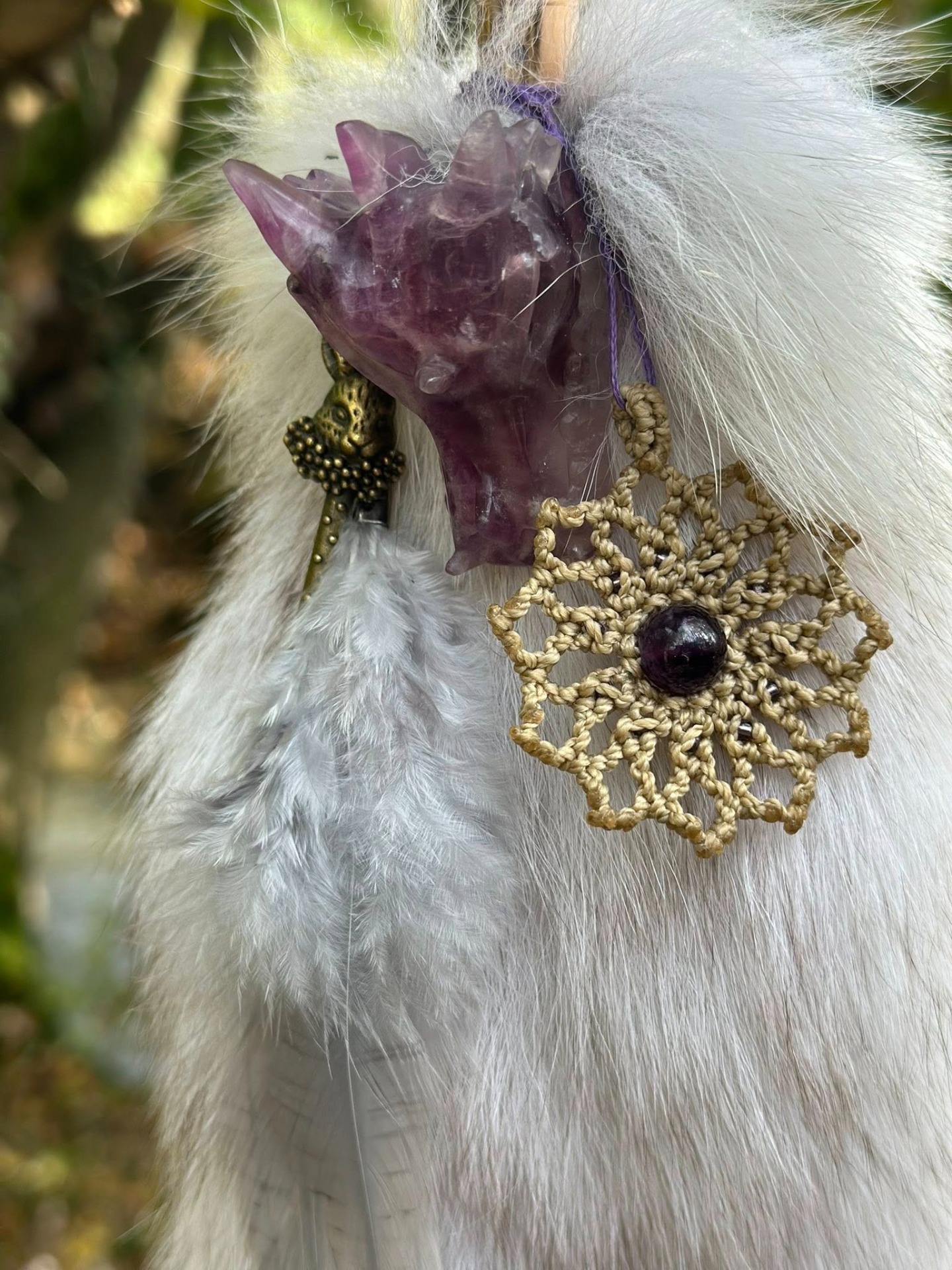 Le mandala doré symbolise l'univers intérieur, le cycle de la connaissance et l'équilibre du féminin sacré.L'améthyste, pierre de l'esprit et du rêve, amplifie les visions, purifie les pensées et relie aux plans supérieurs.Ensemble, ils forment un sceau de lumière : un centre immobile où tout mouvement devient méditation. La Clé au Lapin Magique.