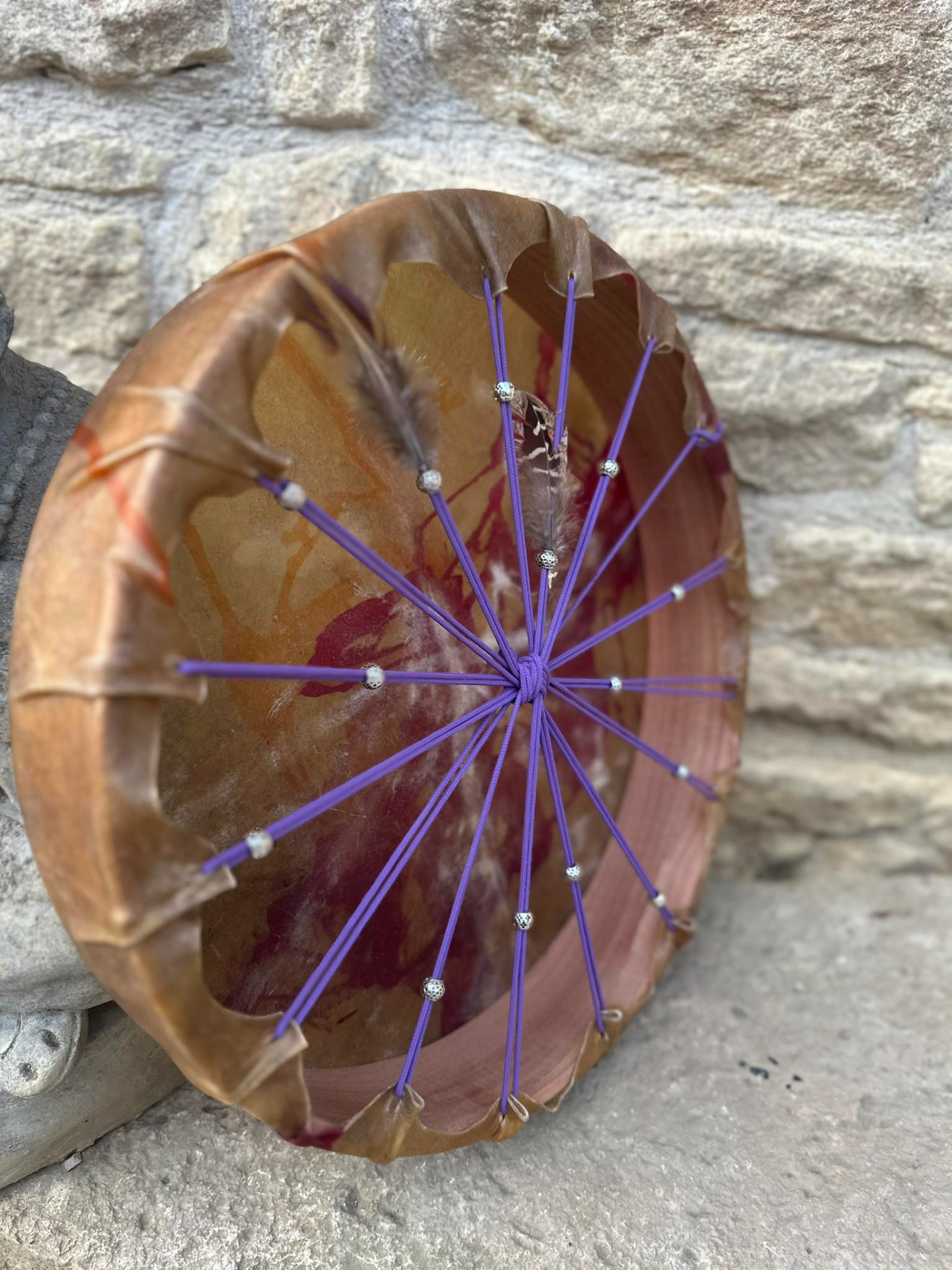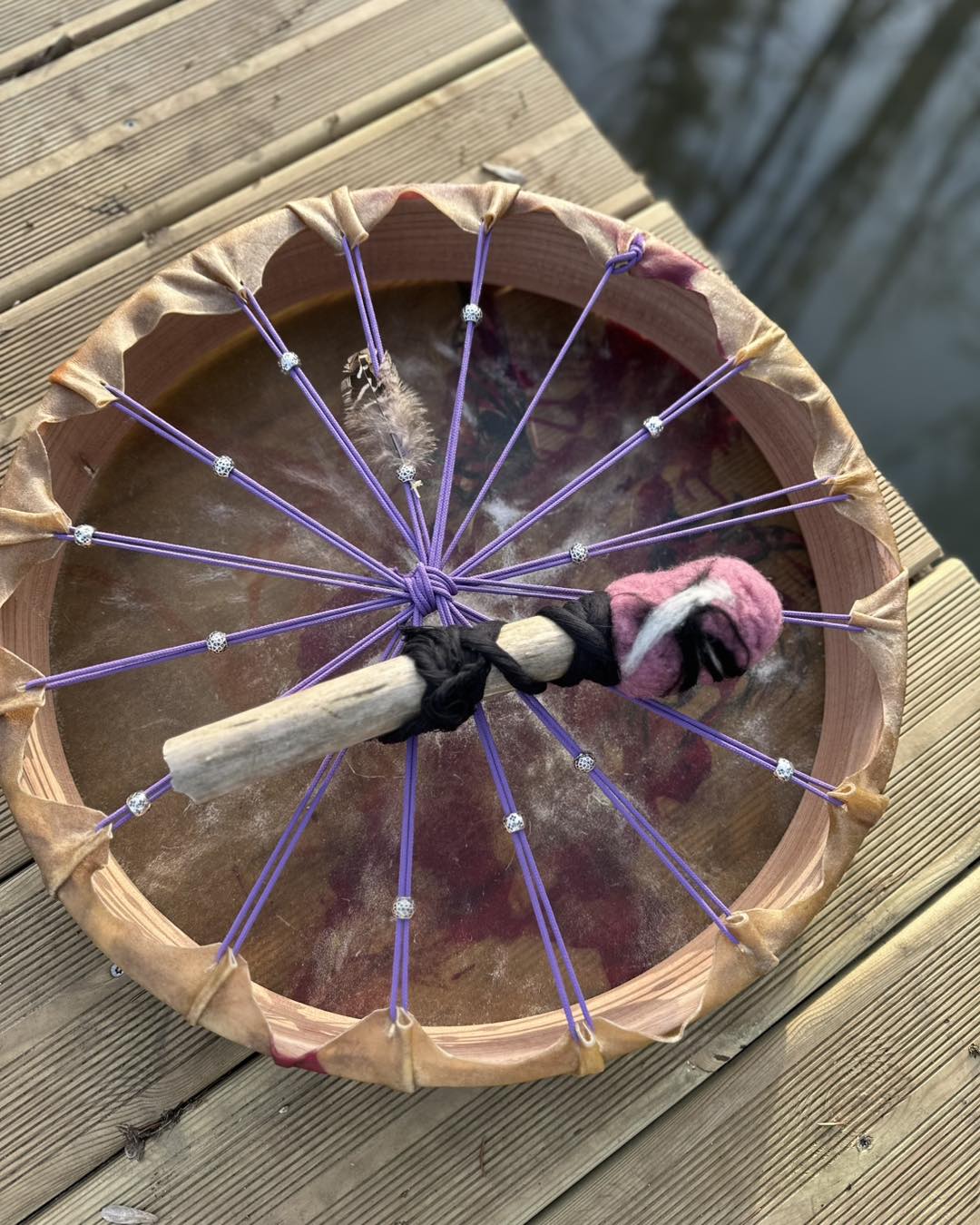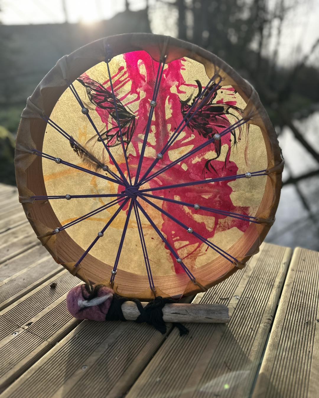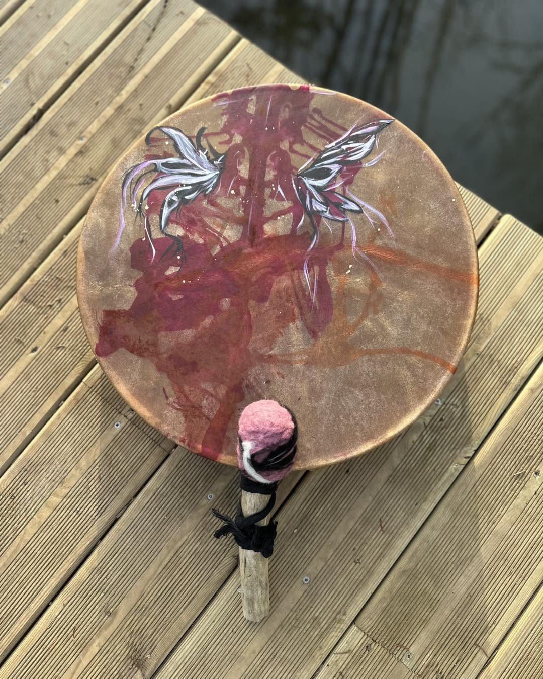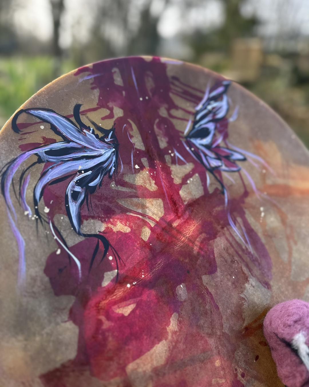 Ce tambour est né ainsi. Une création guidée par la présence subtile du peuple féerique ,entre mystère, nature sauvage et monde chimérique. Les ailes qui apparaissent sur la peau sont comme un passage entre les mondes, un battement entre visible et invisible.