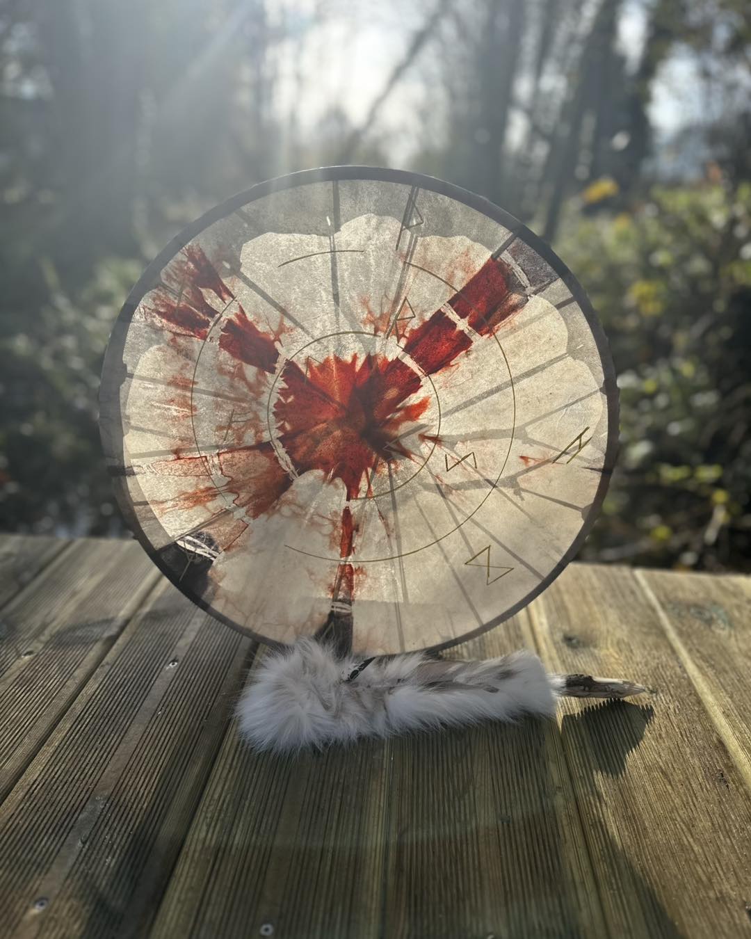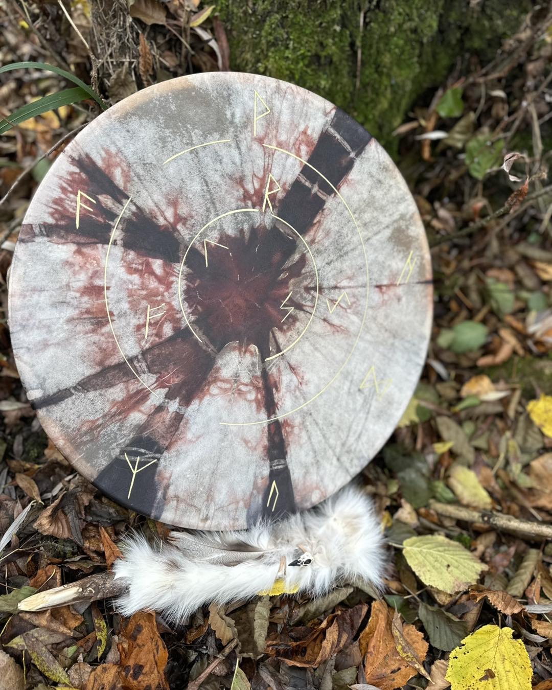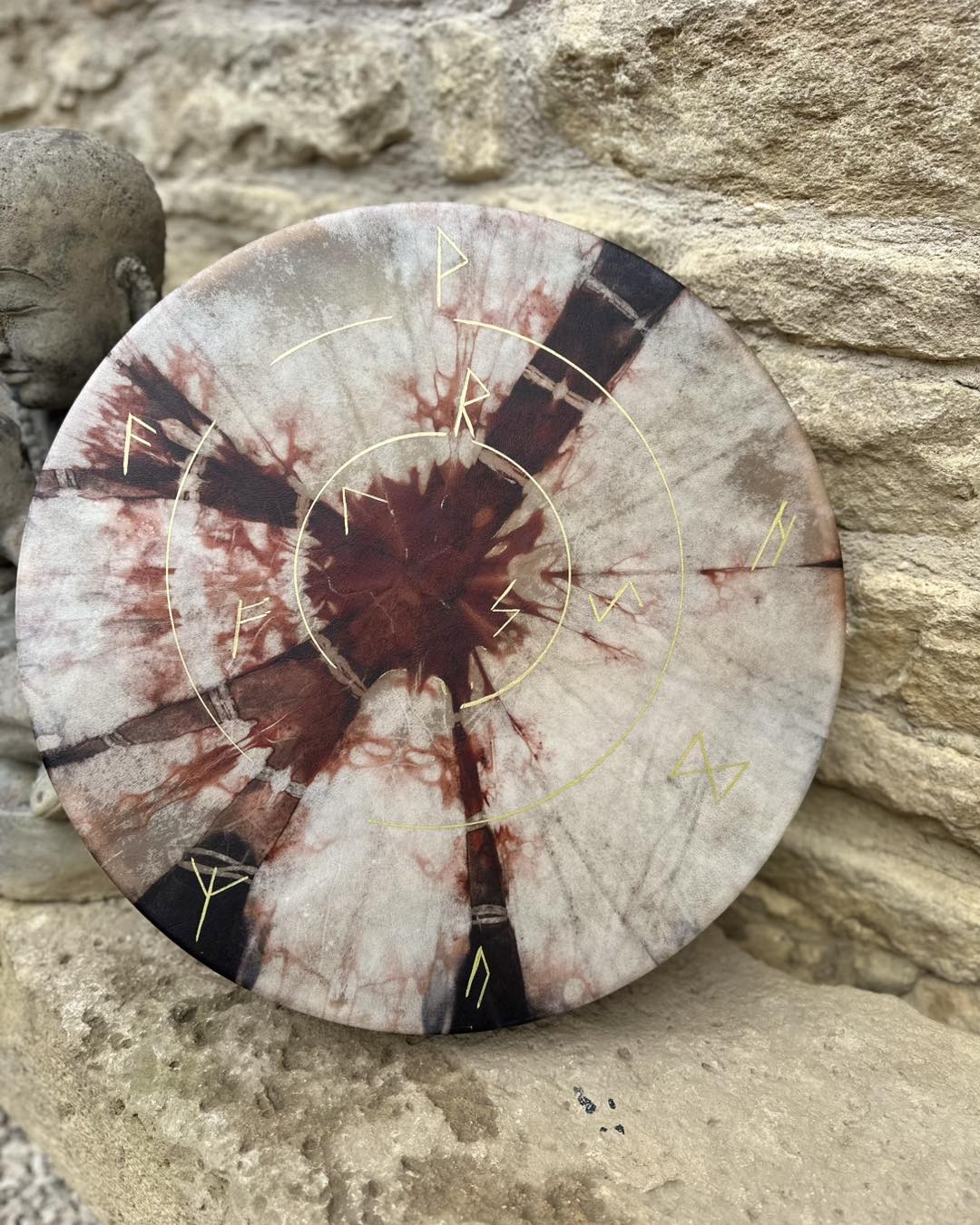 Sólhjarta— il respire la puissance du feu alchimique et du cycle vivant. Les runes dorées s'y inscrivent comme des glyphes de lumière dans la chair du monde, et leur positionnement circulaire autour du cœur rouge représente le soleil intérieur en rotation. La Roue du Feu Doré – Mandala des Transformations .Ce tambour est une porte de passage entre les plans, une roue d'équilibre où chaque frappe réveille les éléments en soi. Les runes y forment un cycle sacré en 11 étapes : Naissance, Force, Illumination, Souffle, Mouvement, Protection, Soleil, Passage, Renaissance, Joie, Tempête.