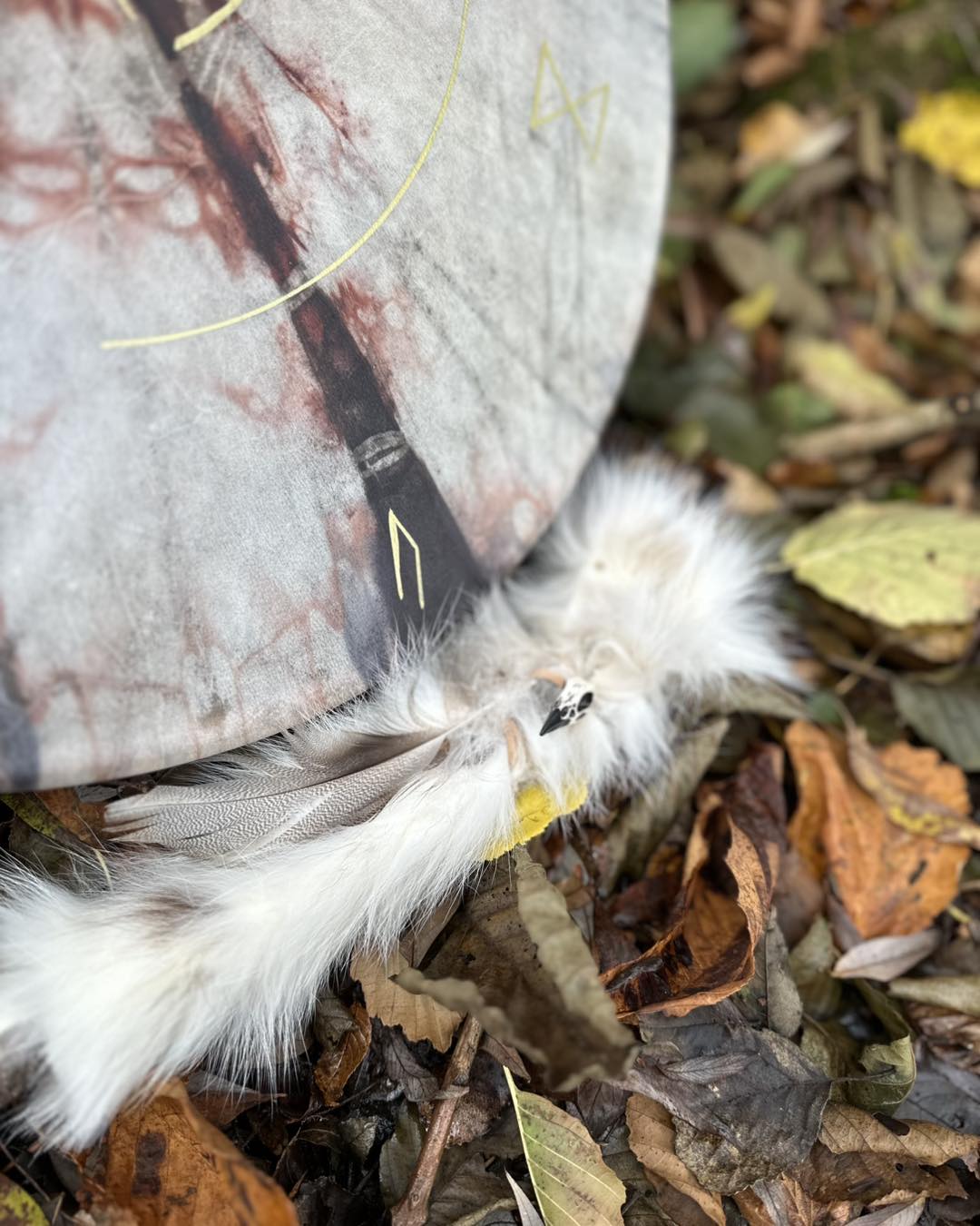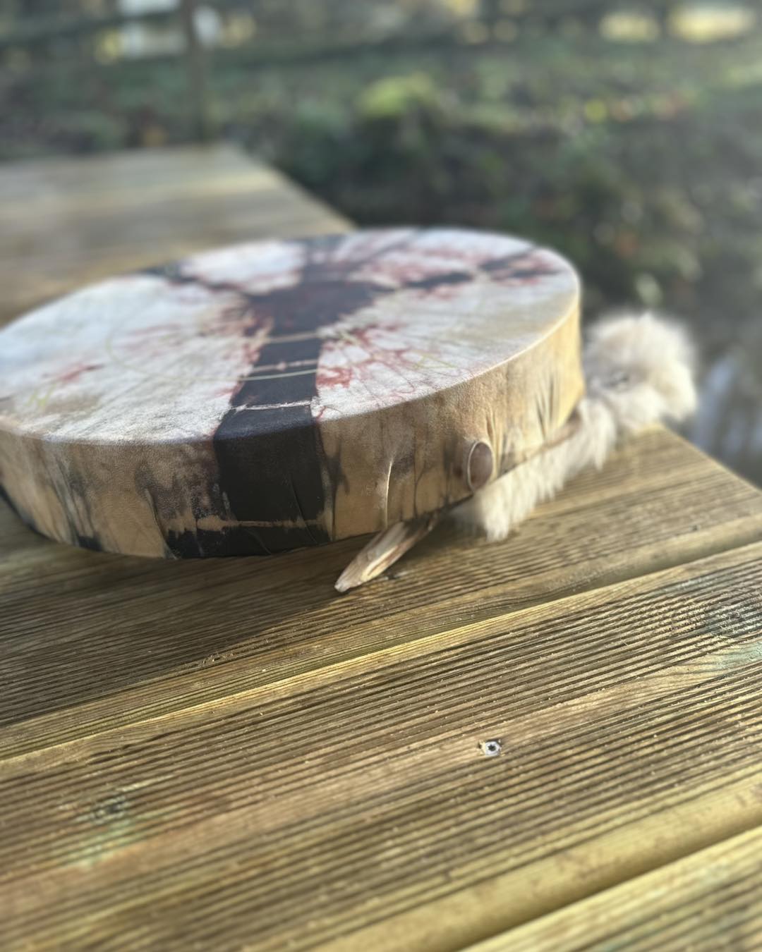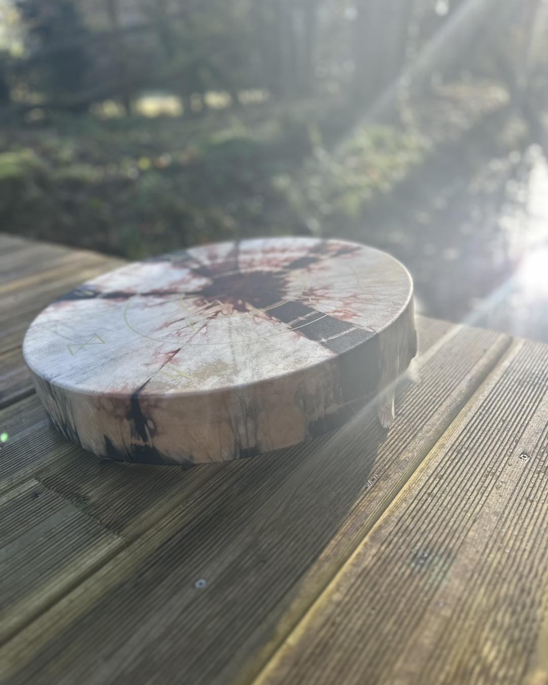 Sólhjarta— il respire la puissance du feu alchimique et du cycle vivant. Les runes dorées s'y inscrivent comme des glyphes de lumière dans la chair du monde, et leur positionnement circulaire autour du cœur rouge représente le soleil intérieur en rotation. La Roue du Feu Doré – Mandala des Transformations .Ce tambour est une porte de passage entre les plans, une roue d'équilibre où chaque frappe réveille les éléments en soi. Les runes y forment un cycle sacré en 11 étapes : Naissance, Force, Illumination, Souffle, Mouvement, Protection, Soleil, Passage, Renaissance, Joie, Tempête.