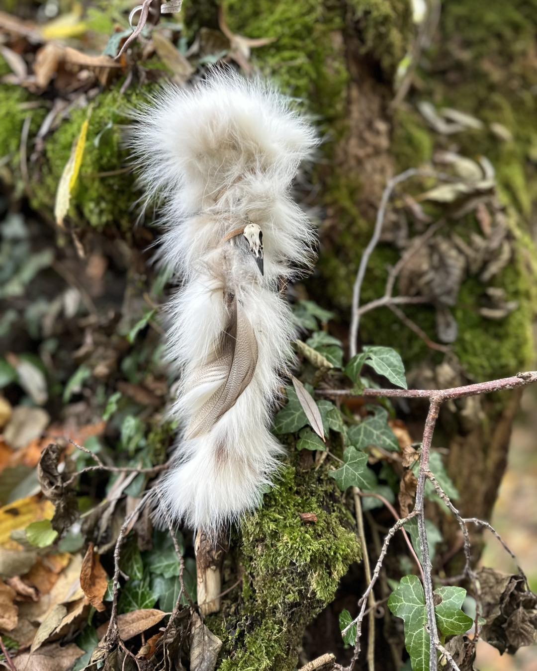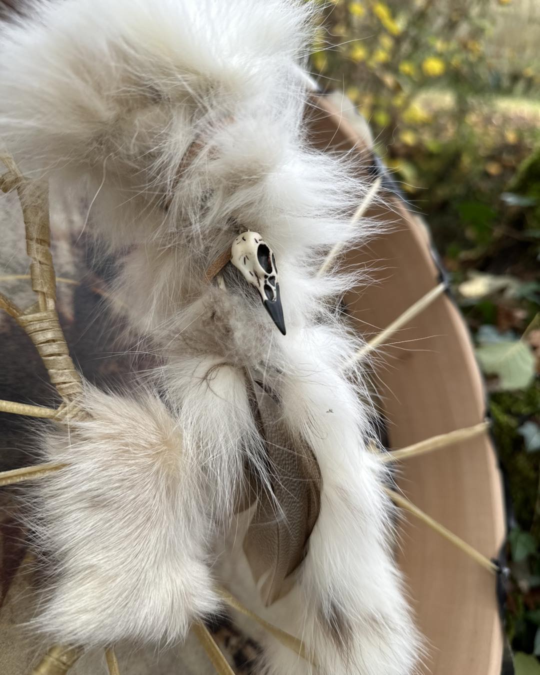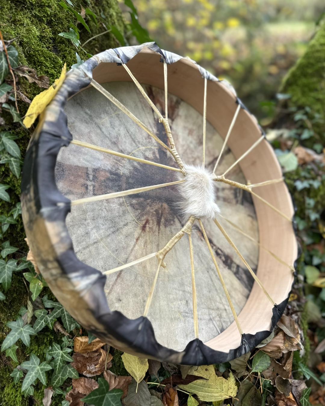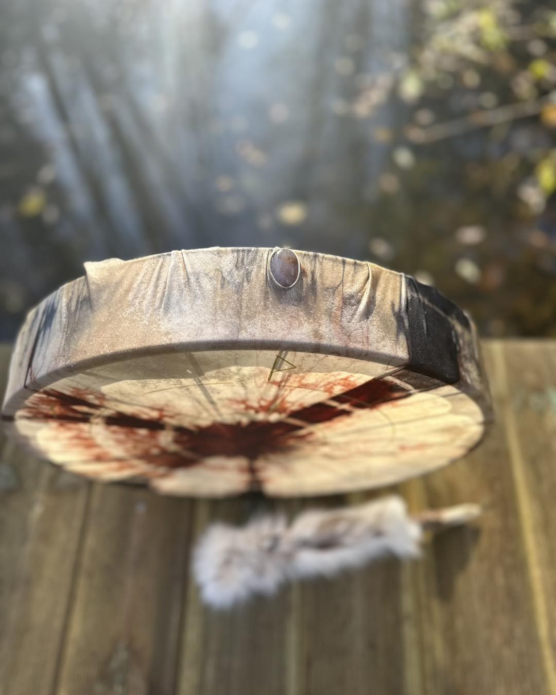 Naissance d'un Tambour de 45 cm en peau de chèvre teintée, bois de Mûrier, pliage intuitif, mailloche fourrure de Lapin recyclée… Un cabochon de calcite bleue est inséré dans la peau....